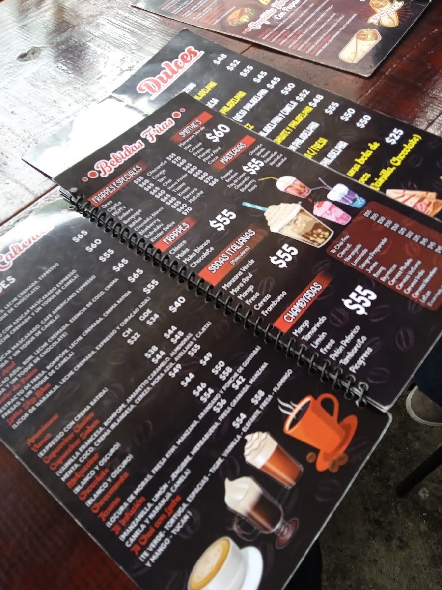 The food options include sandwiches such as the Chapata de Milanesa and Sandwich Montecristo, as well as items like the Hamburguesa de Pollo Asado. Light bites and sweet options are also available, complementing the beverage offerings.